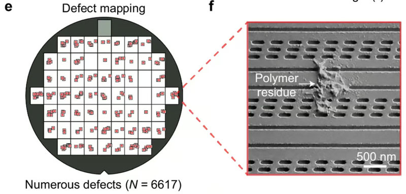 Китайские исследователи провели уникальный анализ причин появления дефектов в производстве чипов на 300-мм кремниевых пластинах. Они буквально заморозили момент на одном из ключевых этапов, что дало возможность оптимизировать последующие операции и достичь 99-процентного сокращения дефектов при производстве микросхем. Такого в индустрии ещё не было и это путь к заметной экономии при выпуске полупроводников. Дефекты на пластине от осаждённого фоторезиста. Источник изображения: Peking University